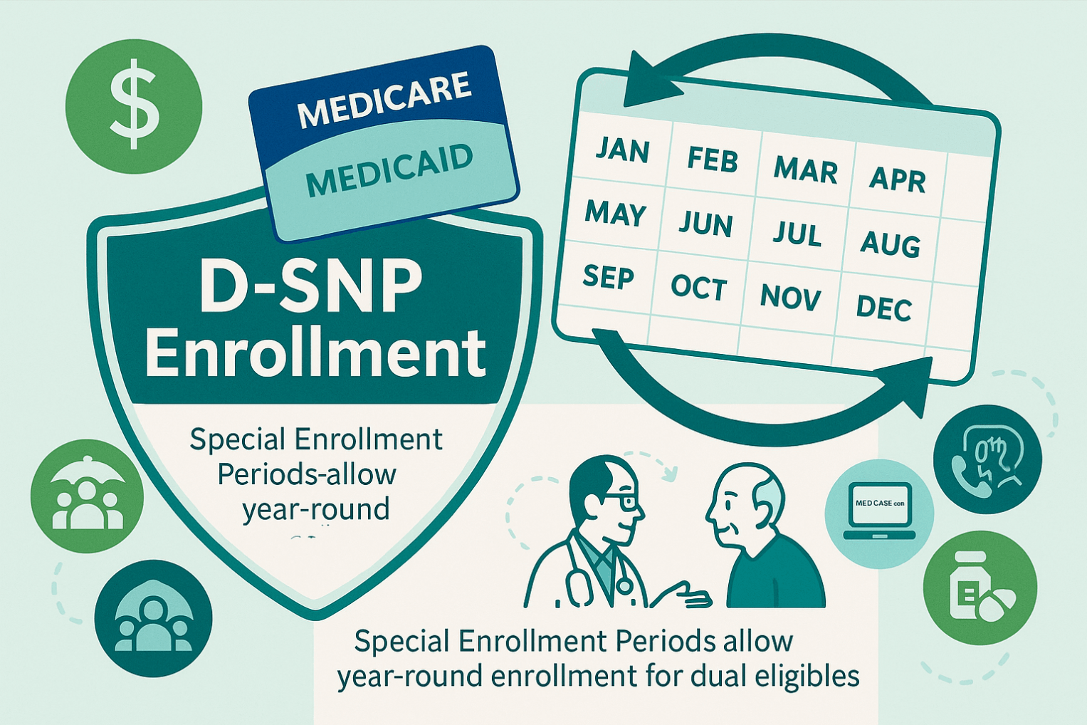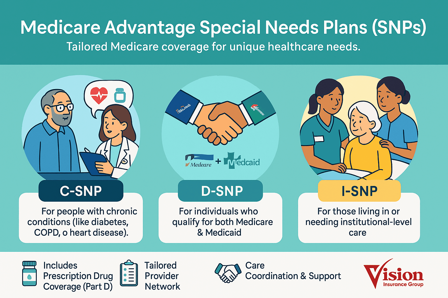 Special Needs Plans (SNPs) are Medicare Advantage (Part C) plans tailored for people with specific circumstances or health needs. They provide all Part A and Part B benefits and usually include Part D drug coverage, plus a coordinated Model of Care (care team, individualized care plans, and targeted benefits). There are three types: C-SNPs for certain chronic conditions (e.g., diabetes, heart failure, COPD, CKD, HIV/AIDS), D-SNPs for people who have both Medicare and Medicaid (dual eligible), and I-SNPs for those living in or needing nursing-home–level care (including qualifying home-based care). SNPs typically feature condition-focused networks, extra benefits (like transportation, dental/vision/hearing, OTC), and lower, more predictable costs. Enrollment is available at standard Medicare periods, and many people qualify for a Special Enrollment Period when they newly meet SNP eligibility.