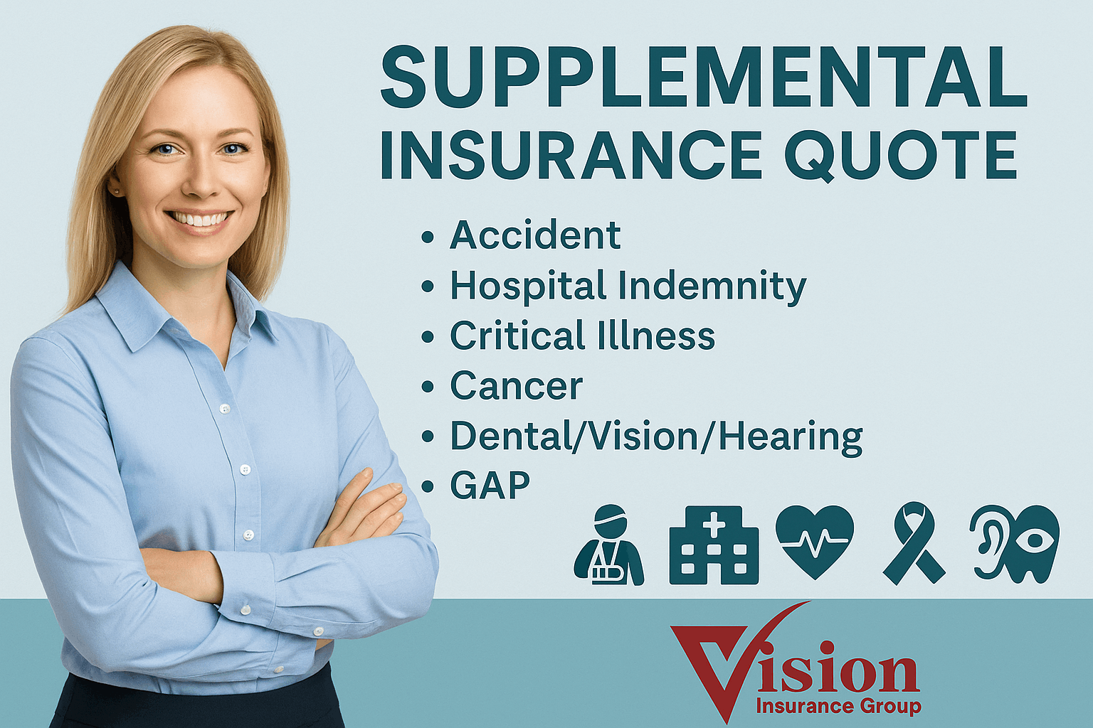 When you request a Supplemental Insurance Quote, you can expect a personalized review of affordable plans designed to protect you from unexpected health and financial burdens. Supplemental insurance includes options such as Dental, Vision and Hearing Insurance, Accident Insurance, Hospital Indemnity, Cancer Insurance, and Critical Illness coverage. These plans provide cash benefits that can help pay deductibles, copays, household bills, or travel expenses while you focus on recovery. To prepare for your consultation, please be ready to share your ZIP code, date of birth, basic health information, and coverage goals (such as family protection, income replacement, or extra help with hospital costs). With this information, we can compare available policies and provide a no-obligation quote that fits your needs and budget.
