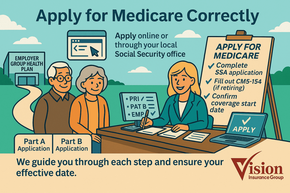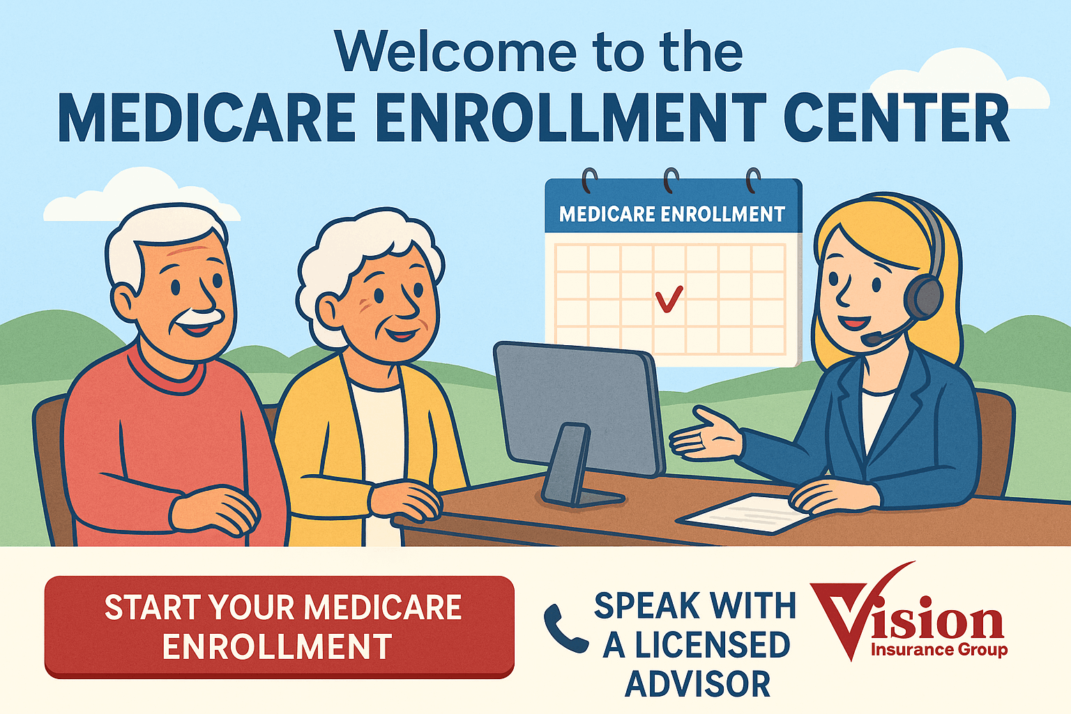 At Vision Insurance Group, we believe Medicare should be simple — not stressful. Our Medicare Enrollment Center was built to help you navigate every step of the process with clarity, confidence, and one-on-one support. Whether you’re applying for Medicare for the first time or reviewing your coverage options, our licensed advisors are here to make it easy — at no cost to you.
