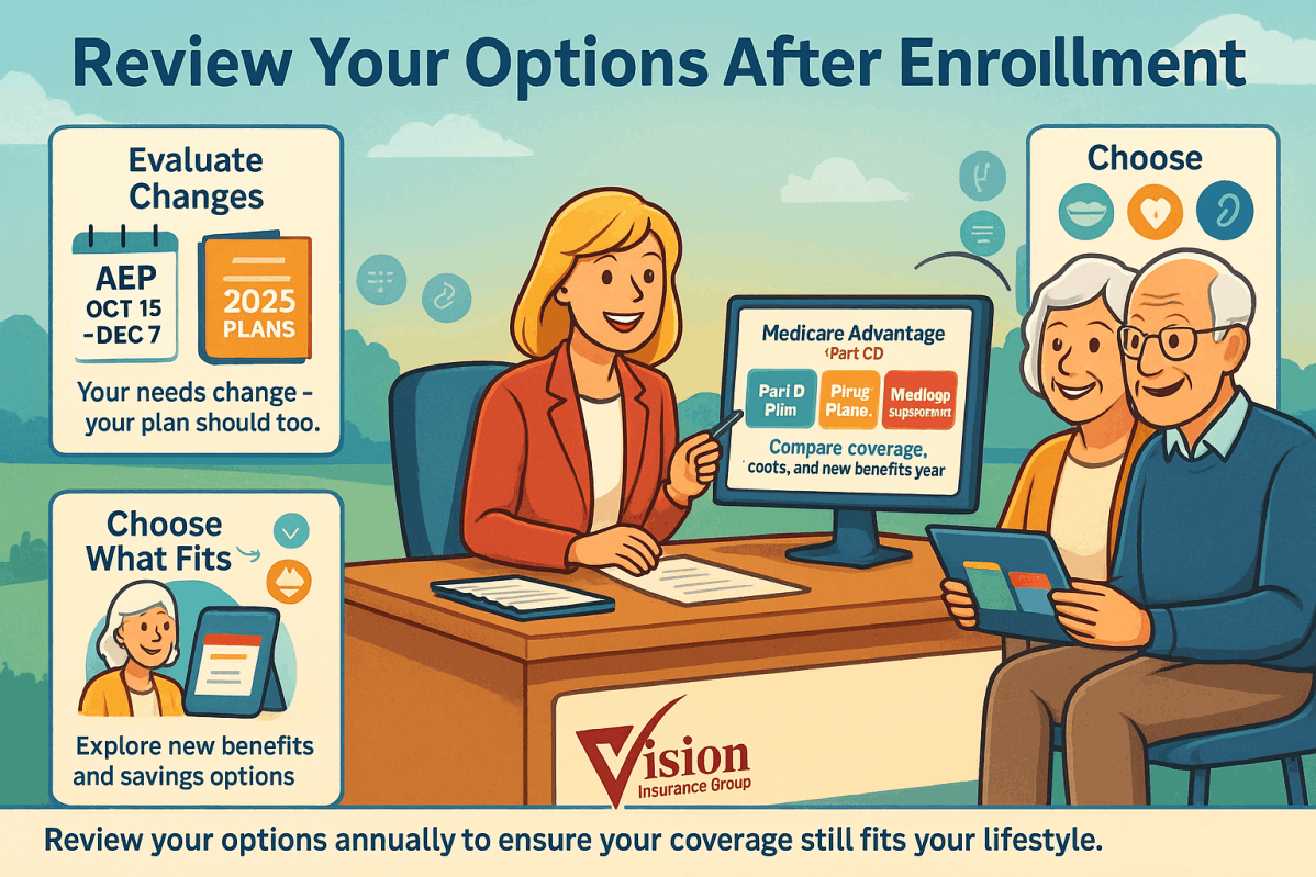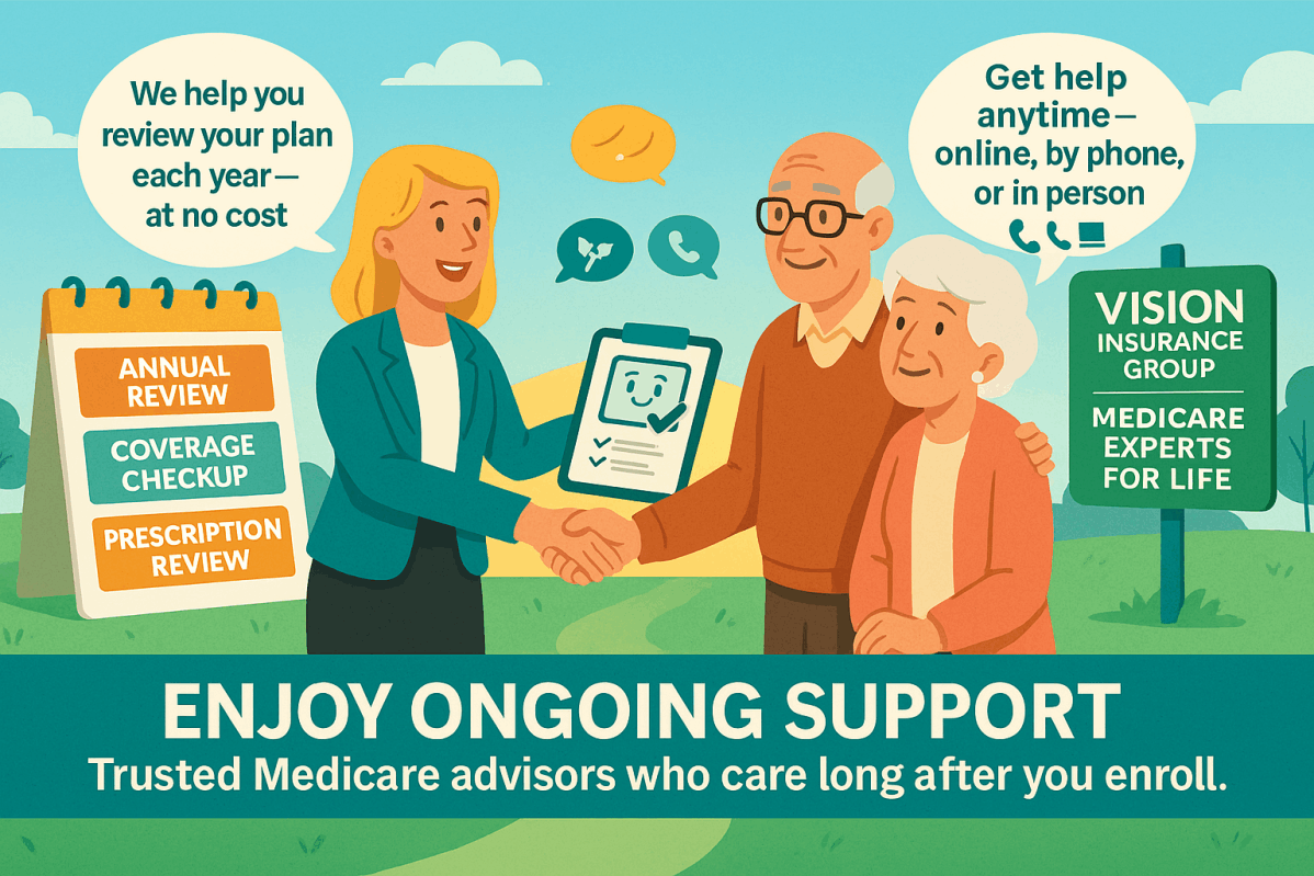 Medicare isn’t a one-time decision — it’s an ongoing journey. Vision Insurance Group provides annual plan reviews to ensure your coverage still meets your needs, helps you evaluate new plan options each year, and keeps you informed about Medicare changes that could affect your benefits.