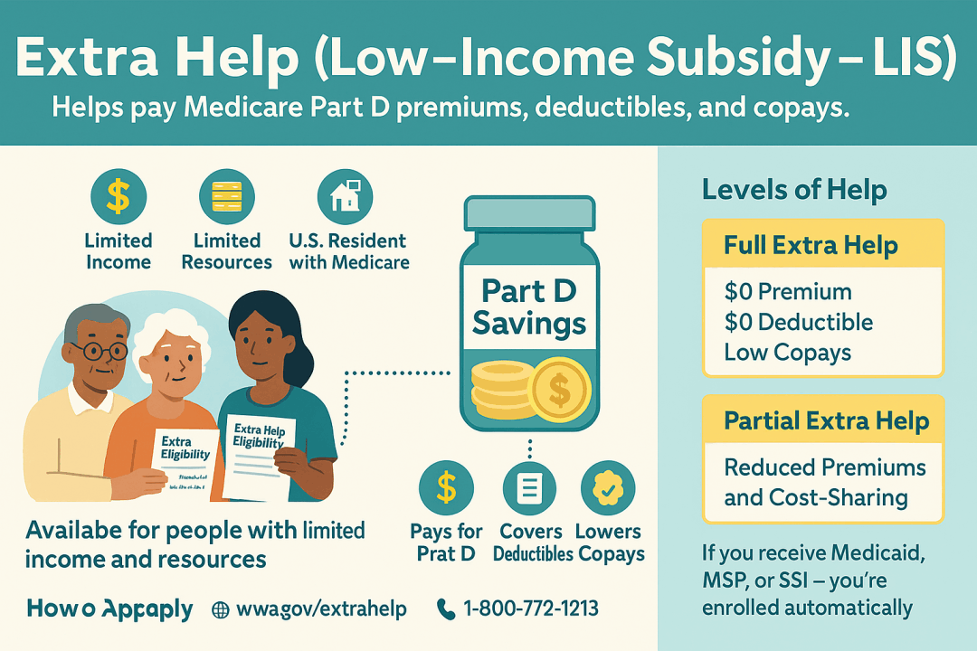 | Extra Help (LIS) | Premiums, deductibles, copays | Low-income beneficiaries | Social Security |