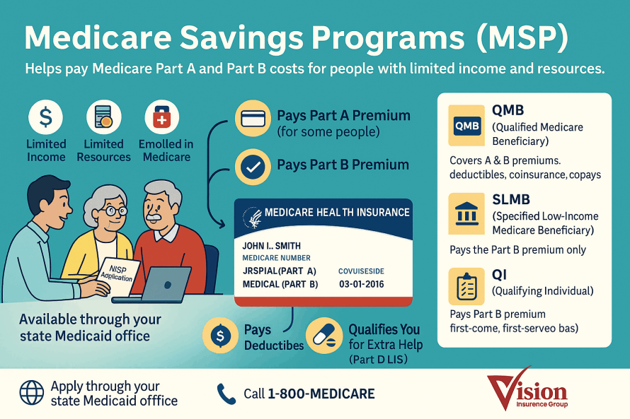 | Medicare Savings Programs (MSPs) | Part A & B premiums | Low-income seniors | State Medicaid office |
