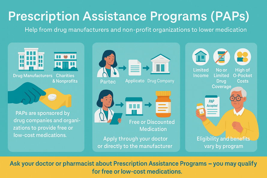 | Prescription Assistance program (PAPs) | Specific brand-name or specialty drugs | Based on income and need | Manufacturer or nonprofit |