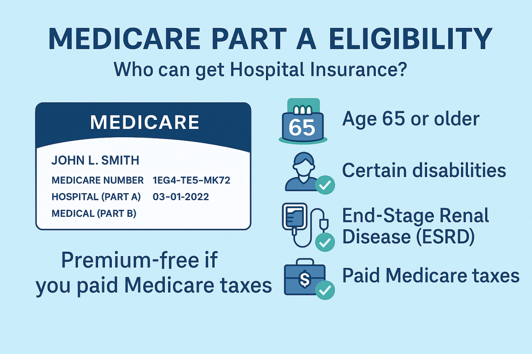 Medicare Part A is hospital insurance that helps pay for inpatient hospital care, skilled nursing facility care after a qualifying hospital stay, hospice, limited home health, and inpatient blood. Most people get it premium-free if they (or a spouse) paid Medicare taxes for about 10 years; otherwise a monthly premium applies. You pay a deductible per benefit period and daily coinsurance after certain day limits. You’re generally eligible at 65+ or earlier with certain disabilities or End Stage Renal Disease (ESRD).