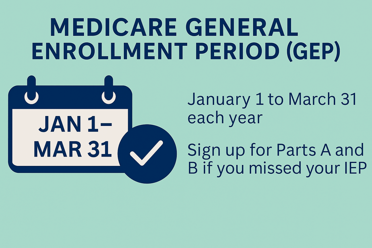 If you miss both IEP and SEP, you can enroll during the General Enrollment Period (GEP) which occurs between Jan 1–Mar 31 each year, with coverage beginning the first day of the month after you enroll.