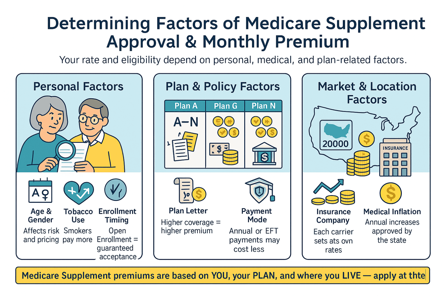 Here are the main factors that drive a Medicare Supplement (Medigap) monthly premium: