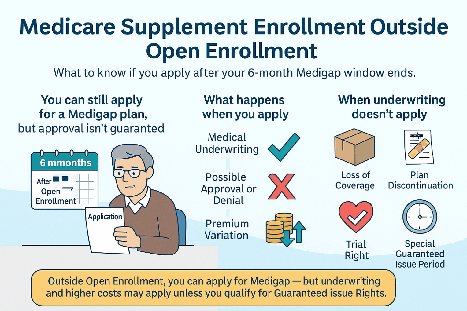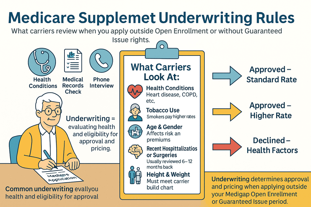 Medicare Supplement (Medigap) underwriting is the health-screening process most insurers use when you apply outside your one-time Open Enrollment Period (the first 6 months you’re 65+ and enrolled in Part B) or outside a Guaranteed-Issue (GI) situation. During underwriting, a carrier can review your medical history, recent conditions and treatments, medications, height/weight, tobacco use, and sometimes doctor or hospital records. Based on that review, the company may approve you, charge a higher premium, add a waiting period for pre-existing conditions (up to 6 months if you lacked recent creditable coverage), or decline the application. In GI situations—like losing qualifying employer coverage or using the “trial right” after trying an MA plan—carriers must accept you with no health questions.