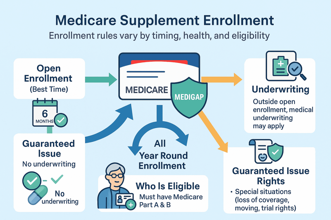 To enroll in a Medicare Supplement (Medigap) plan, you must have Medicare Parts A and B and live in the plan’s service area. The best time to enroll is during your 6-month Medigap Open Enrollment Period, which starts when you’re 65 or older and enrolled in Part B. During this time, you have guaranteed acceptance—no health questions or denials. After this window, you can still apply, but insurers may use medical underwriting and charge more or deny coverage. Some people qualify for Guaranteed Issue rights if they lose coverage or leave a Medicare Advantage plan. MACRA, Plans C and F are unavailable to those newly eligible for Medicare after January 1, 2020.