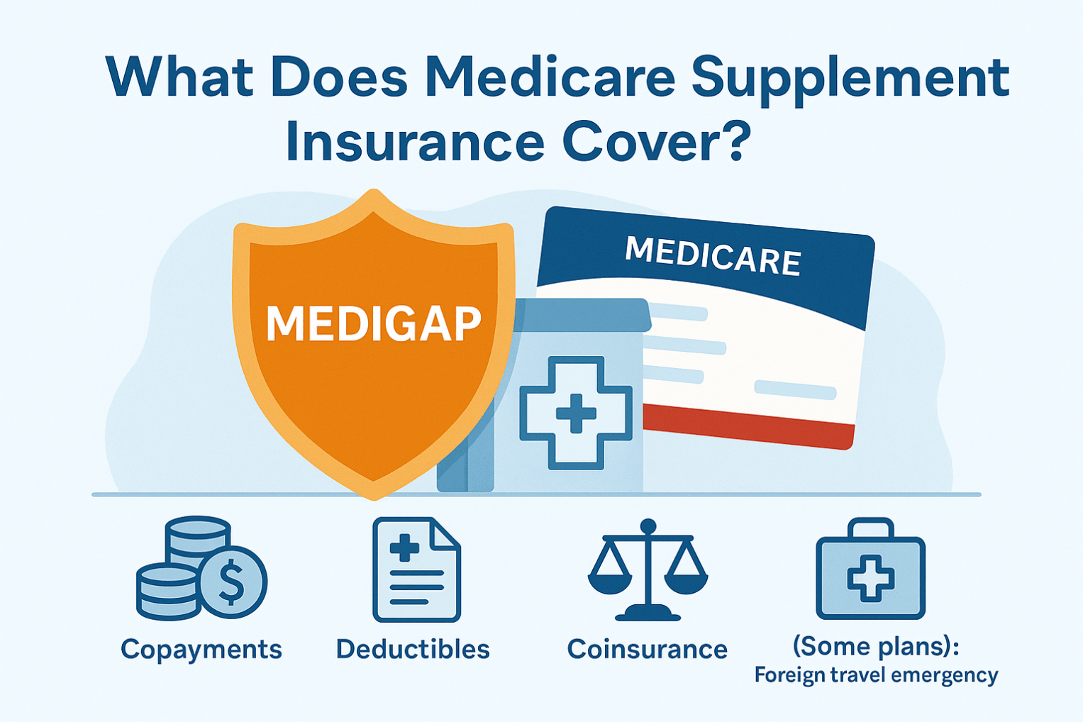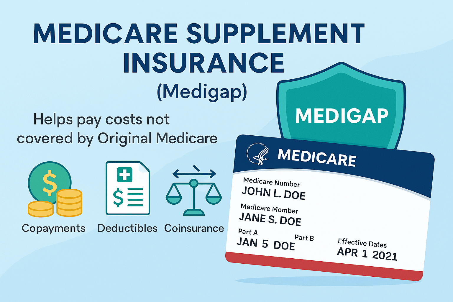 Medicare Supplement Insurance — also known as Medigap — is private insurance that helps pay the “gaps” in Original Medicare (Parts A and B). It is designed to cover out-of-pocket costs such as deductibles, copayments, and coinsurance that Medicare doesn’t pay.