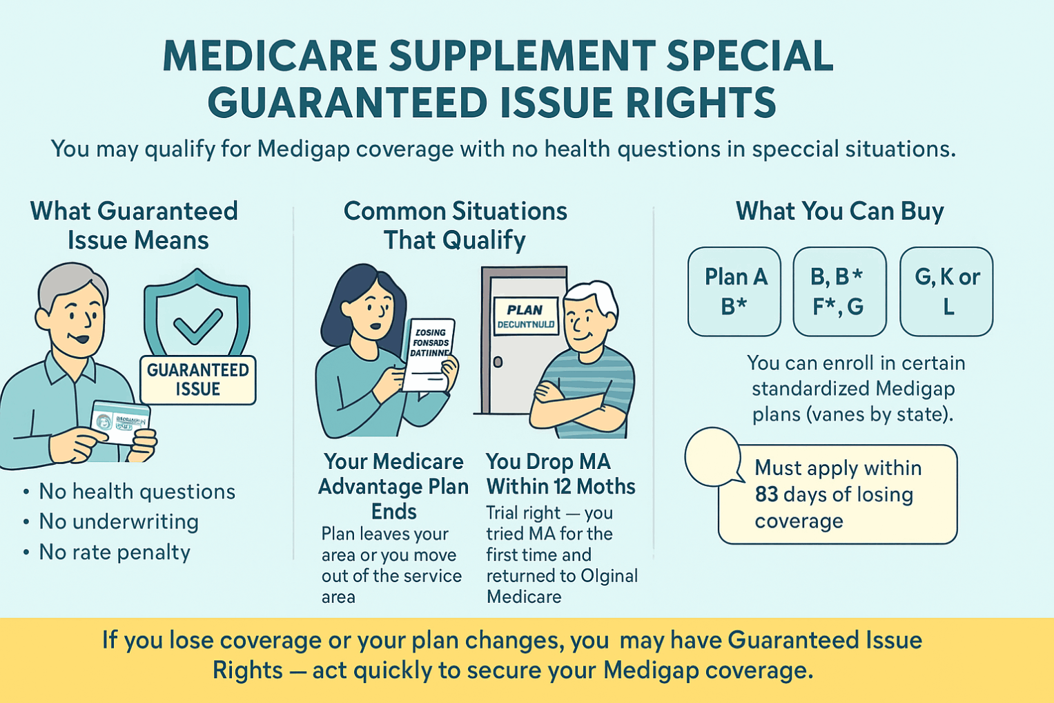 | Special Guaranteed Issue Rights | Within 63 days of losing certain coverage (e.g., MA plan trial right, employer coverage ends) | Guaranteed Issue applies |