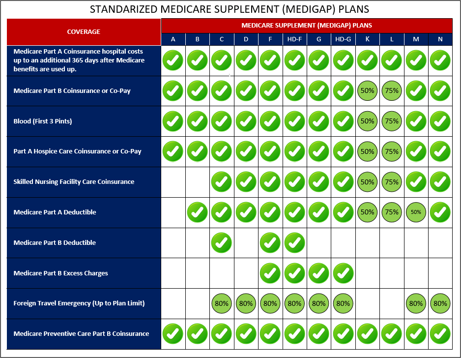 The table below illustrates the Standardized Medicare Supplement (Medigap) plans the what each plan covers.