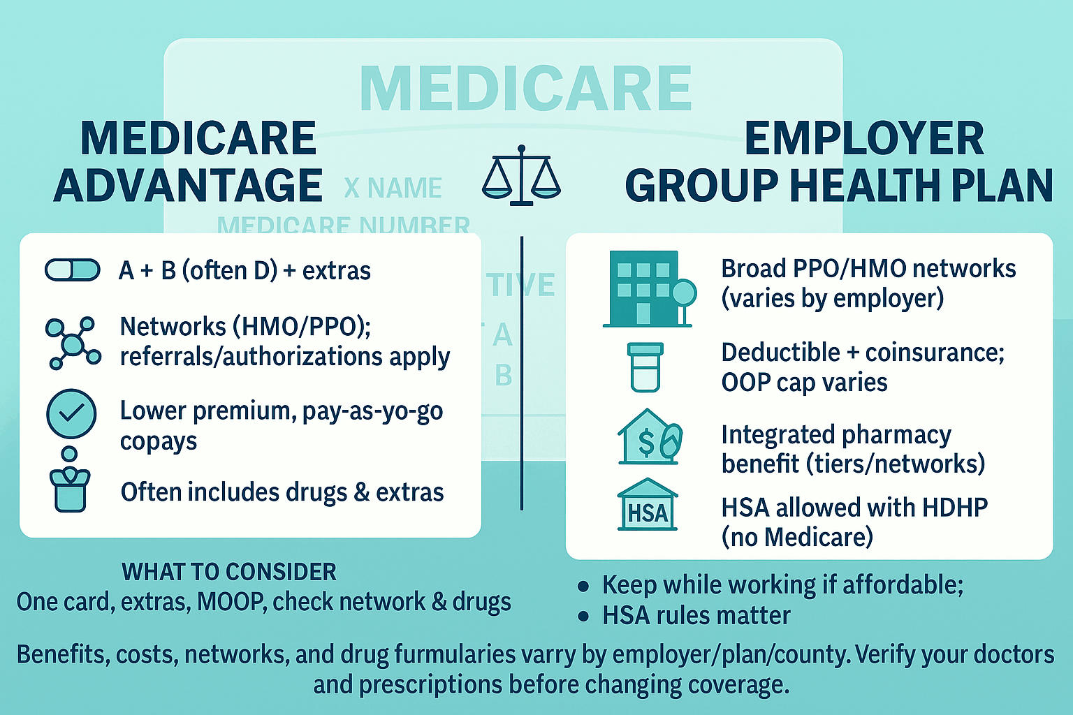Medicare vs. Employer Group Health Plans (EGHP), in brief: At 65, you can keep EGHP or switch to Medicare; the smarter choice depends on costs, coverage, and employer size. If your employer has 20+ employees, the EGHP usually pays primary and you can often delay Part B without penalty (verify Part D creditable drug coverage). With fewer than 20 employees, Medicare pays primary—so you generally should enroll in Part A and Part B to avoid denials and penalties. Compare total cost (payroll premiums + deductibles/out-of-pocket) vs. Medicare (Part B premium, optional Part D, Medigap or Advantage). EGHPs may offer family coverage and HR-managed networks; Medicare offers broad access (Original) or managed networks (Advantage) with an out-of-pocket max on Advantage plans. Note: once any part of Medicare begins, you can’t contribute to an HSA; and COBRA/retiree coverage usually isn’t a safe substitute for delaying Part B.